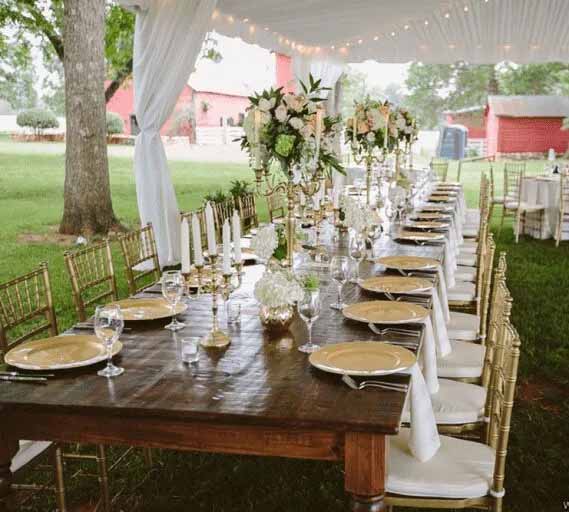 - Tabletop & Linens – Mason jars, mismatched china, charger plates, runners